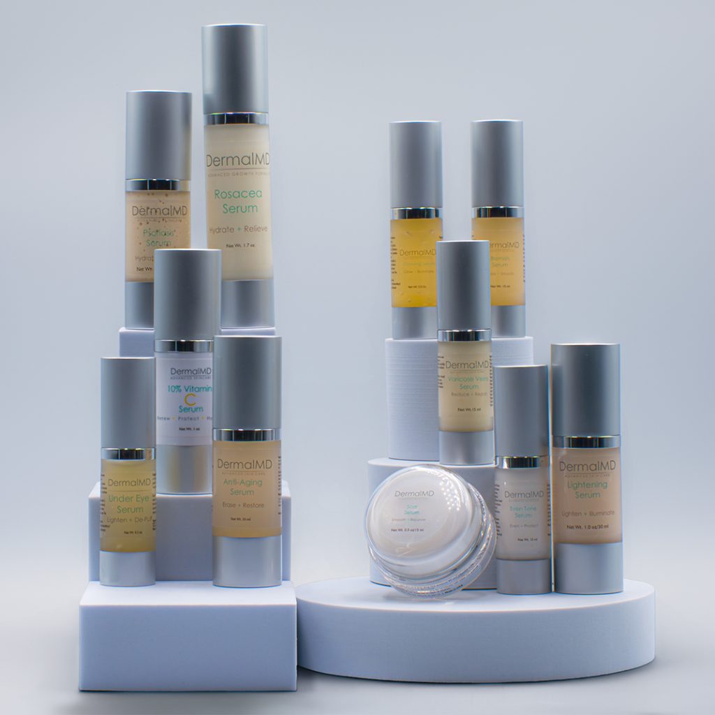 DermalMD formulates lightweight serums for specific concerns. The Cellulite Reduction Serum targets dimpling and poor skin texture by combining tightening, circulation support, and hydrating actives. The Stretch Mark Serum is designed to hydrate and encourage collagen and elastin production to improve the appearance of stretch marks. The Scar Serum focuses on improving scar texture and tone while supporting remodeling. The Varicose Vein Serum aims to reduce visible discoloration and support microcirculation to improve appearance. For product specifics, see DermalMD’s Body product pages.